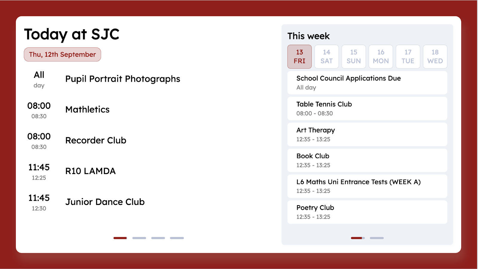 With the help of our Categories feature, you can make sure relevant calendars are shown in the right place. For example, staff want to see upcoming training, meetings and social events in the staffroom, whereas you could display sports fixtures in the PE building, or trips and after school activities in reception for parents.